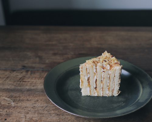 ほろほろのスポンジ生地とやさしい甘さのクリームの層から香ばしいくるみのアクセントがのぞきます。