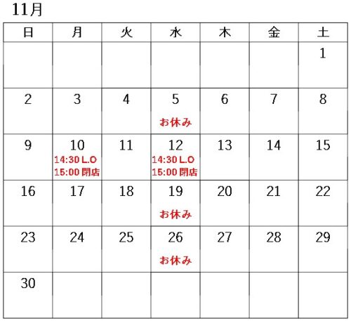 ◆11/5、11/19、11/26の水曜日がお休みになります。