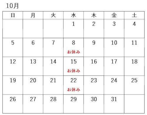 ◆10/8、10/15、10/22の水曜日がお休みになります。