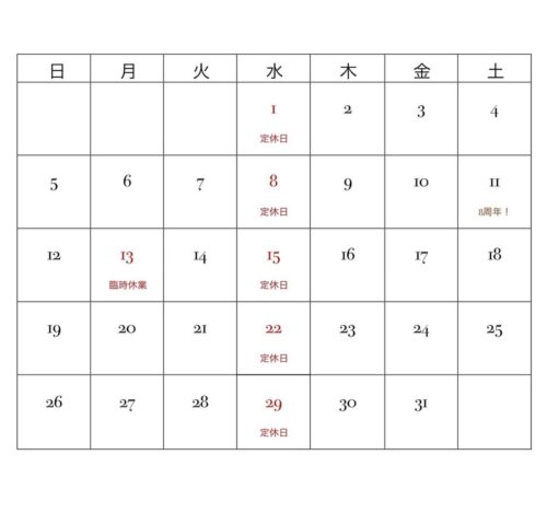 10月は毎週水曜日の定休日に加え、13日(月)が臨時休業です